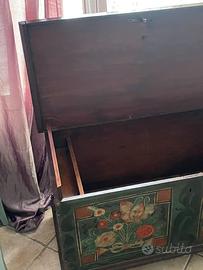 Cassapanca di legno trentina con decori floreali fatti a mano in ottime condizioni. Veniva usata per riporre la biancheria della casa essendo sollevata da terra non prende umidità, veniva usata anche come seduta davanti al tavolo da pranzo