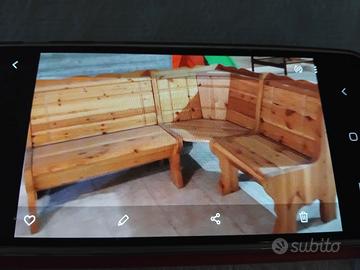 legno massello, abete laccato, con scomparti sotto i sedili, forma a elle, lato lungo 170 cm, corto 140, altezza schienale 94, seduta 54, ideale per cucina o taverna. ritiro in loco.
