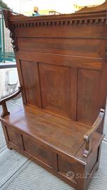 Cassapanca Impero con seduta inizi '900 vendo come da fotografie per maggiore dettaglio. La larghezza della base è di circa 150 centimetri. Può essere utilizzata per sedersi, per esempio all'interno di uno studio in sala d'attesa. Il contenitore è ampio e può essere utile per riporre scarpe, ombrelli, cappelli o altro. Posso se richiesto dare una lucidata complessiva con cera all'intera struttura prima della consegna. Visibile a Bergamo città