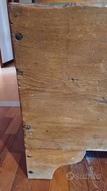 Cassapanca in larice lunga 220cm profonda 45cm. Composta da tre plance intere spesse 3,5 cm lunghe 220cm e alte 48cm. Datata circa 1800.