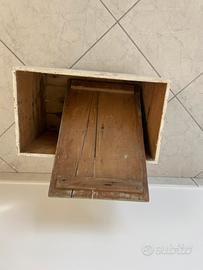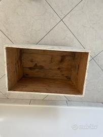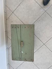 Questa è una cassapanca in legno con finitura in stile shabby chic, caratterizzata da una vernice bianca e verde scrostata che le conferisce un aspetto invecchiato e rustico. Può essere utilizzata come mobile contenitore o come elemento decorativo, ideale per ambienti che richiamano lo stile country o vintage.