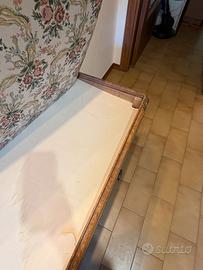 Panca/cassapanca in legno con specchiera coordinata, primi ’900, in buono stato generale. Da sistemare il pannello sotto il cuscino e l'imbottitura del cuscino stesso.