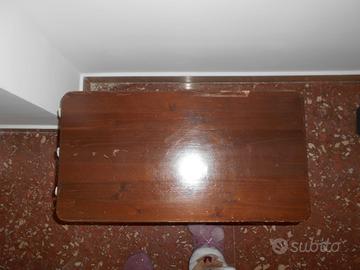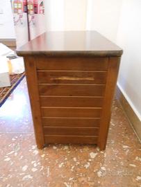 Cassapanca in legno di colore medio con gole laterali dove inserire le dita per spostarla (foto 2).