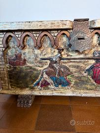 Cassapanca in legno di cedro intagliato. Stile gotico con guerrieri. In perfetto stato. Dimensioni: 115 cm x 48 cm x 52 cm