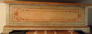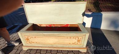 Cassapanca di famiglia, in legno, fatta decorare a mano da un artigiano locale con motivi ocra eleganti. Apertura superiore. Oggetto dai molti usi e spazi, ma anche per lo shabby chic. Vendo per problemi di spazio. Colori: verde acqua, bianco e ocra con ultima mano anticata Misure: larghezza cm. 139 profondità cm. 55 altezza cm. 49