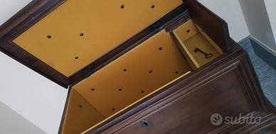 Cassapanca in legno massello, già restaurata internamente e adattata come mobile bar. Interno rifinito con scomparti, supporti e predisposizione per bottiglie e bicchieri. Struttura solida, coperchio funzionante con cerniere. Esterno in buone condizioni con normali segni del tempo che ne confermano l’autenticità. Oggetto versatile: mobile bar, contenitore, elemento d’arredo. Dimensioni 107 x 59 cm Altezza 66 cm Ritiro a carico dell'acquirente a Ciriè (TO)