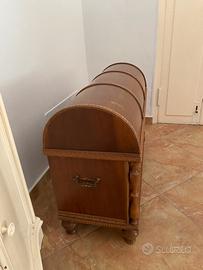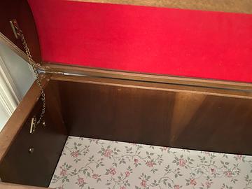 Cassapanche in stile Rinascimento (riproduzioni del XX secolo): splendida cassapanca antica in legno massello di noce, finemente lavorata con intagli artigianali e rosone centrale in rilievo (stile Rinascimentale). Il mobile è in ottime condizioni, solido e pronto all'uso. Dettagli di pregio: Interni curati: Sottocoperchio rivestito in elegante velluto rosso con catenella di sicurezza originale. Fondo protetto: Base foderata con carta floreale raffinata, ideale per biancheria o corredo. Estetica: Piedini a cipolla torniti e venature del legno a vista. DIMENSIONI: 81 x 60 x 33 cm (L x H x P) 📏 Dimensioni: 81 x 60 x 33 cm