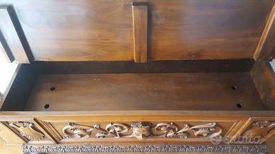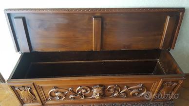 Vendo cassapanca in legno di noce massiccio intagliata con piedi a zampa di leone larghezza 160, altezza 60, profondità 50.