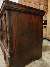 Splendida cassapanca in cirmolo ed abete proveniente dalla Valle Aurina, datata 1667, dipinta poi con decori Shablonen e Doppeladler austro-ungarica nel 1690, come da data sullo zoccolo.