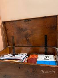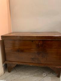 Piccola cassapanca d’epoca in legno .Necessita di una sistemazione di finitura esterna ,nonprobli di struttura.