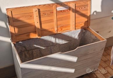 Cassapanca usata per la legna. Buono stato, nessun danno. La cassa panca ha anche delle ruote per facilitare lo spostamento. Dimensioni: Larghezza 100, altezza 58, profondità 41 cm.
