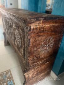 Vendo splendida cassapanca siriana antica in legno, lavorata a mano con raffinati intarsi geometrici. Un pezzo unico di grande fascino, ideale come contenitore o come elemento d’arredo decorativo. Perfetta per donare un tocco orientale ed elegante a qualsiasi ambiente.