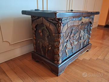 Cassapanca spagnola in legno molto carina con intagli sui tre lati. Misura 78 cm x 38 cm x 48 cm di altezza. Adatta a molti tipi di arredamento unisce estetica e funzionalità come contenitore. Consegna a mano.