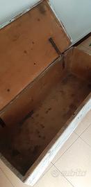 Cassapanca vecchia in legno color legno naturale con striature bianche. Misure 40x52x106 cm.