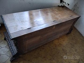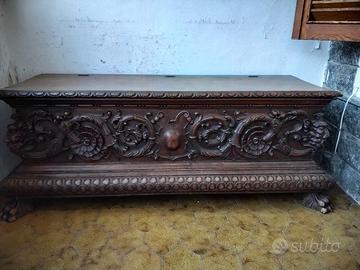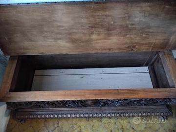 Cassapanca in legno massello con lavorazioni in rilievo inizi 900 …struttura solidissima ..il fondo è provvisorio ma a richiesta puo essere fornito e verniciato….
