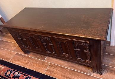 Cassapanca vintage in legno dimensioni massime 115x 44cm altezza 52 cm con spazioso vano contenitore. Legno massello, verniciata parecchi anni fa in marrone. Sarà possibile restaurarla togliendo la vernice (che da foto si vede già sfogliata in più punti) e ripristino del fascino legno naturale; oppure con una mano di cementite la si può colorare a piacimento per ambientarla in un arredo moderno. Non ci sono segni di tarlo o parti scalfite, legno in ottime condizioni, chiedo 100 euro.