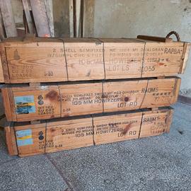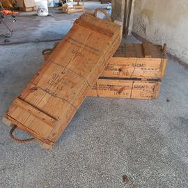 Casse porta munizioni in legno vuote apribili sulle estremità mediante galletto a vite, dove sono presenti le maniglie in corda.