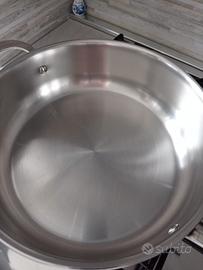 Casseruola bassa Lagostina 26 cm modello Evelia in acciaio inossidabile 18/10 con coperchio in vetro temperato. Fondo triplo strato. Adatta a tutti i piani di cottura, induzione inclusa, e al forno, senza coperchio, fino a 250°. Usata poche volte, ha qualche graffio esterno