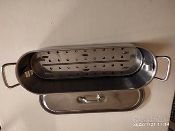 Pentola o casseruola Ideale per cuocere il pesce sia bollito che al vapore, o qualsiasi cosa possa essere bollita come anche il cotechino. con griglia coperchio e manici in acciaio inox, diametro cm 47 , con manici cm 52, H cm 10, profondita' cm 16, tipologia cottura gas, usata solo 2 volte, come nuova. Vendo causa inutilizzo.