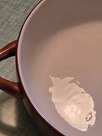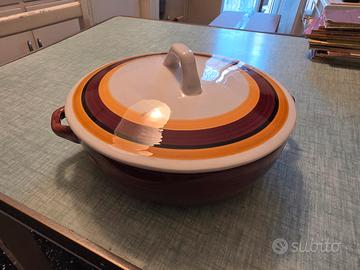 Casseruola con coperchio in ceramica smaltata, autentico pezzo vintage italiano degli anni '70. L'oggetto presenta una base marrone con due manici integrati e un coperchio bianco decorato con motivi circolari nei toni del giallo, ocra e testa di moro. Dettagli: Origine: Prodotta in Italia. Lavorazione: Decorazione eseguita a mano ("Décoré à la main"). Stato: Ottime condizioni estetiche, colori vividi e smalto lucido. Non si notano crepe o sbeccature significative. Perfetta per chi ama il design retrò o come elemento d'arredo funzionale per una cucina in stile vintage.