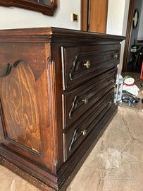 Vendo mobile cassettone vintage, realizzato in legno massiccio di colore scuro intenso con finitura lucida. L120-H84-P55