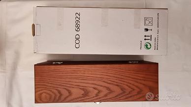 Elegante set sommelier con accessori, contenuto in una cassetta di legno colore ciliegio. Il set è nuovo, mai utilizzato con la scatola originale, include i seguenti accessori: anello salvagoccia, tappo salvavino, tappo versatore, termometro analogico, cavatappi professionale che include: cavatappi, apribottiglie, tagliafili