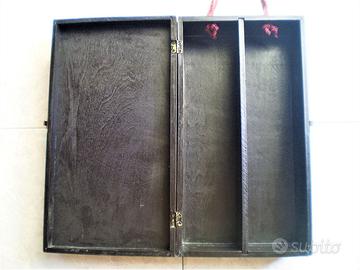 MISURE: misure esterne in cm: 34 x 19 x 9; misure interne in cm: del fondo 32,5 x 17 x 6, spazio di uno scomparto cm 8,4; del coperchio 32,5 x 17 x 2; spessore legno cm 0,8