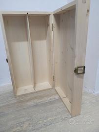 Capienza: Può contenere 2 bottiglie standard. Caratteristiche: Dotata di divisorio interno in legno e chiusura metallica laterale perfettamente funzionante. Stato: Ottime condizioni, legno chiaro e pulito.