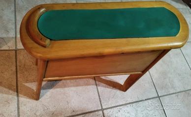Cassetta lustrascarpe Sciuscià in faggio prodotto dallo storico marchio Fraber del mobilificio Fratelli Bertoli. Un oggetto raro, d'altri tempi, un pezzo da collezione dallo stile Mid-Century. Periodo di produzione: 1960 - 1969. Nel complesso in buone condizioni anche se presenta segni del tempo e le cerniere andrebbero sostituite. Sorretta su quattro gambe unite ad arco si trova la piccola cassetta per riporre spazzole e cera. Il coperchio che si apre a libro è inclinato per appoggiare il piede e porta l'alloggio per il tacco. Un pezzo unico nel suo genere!