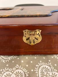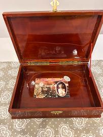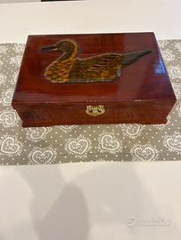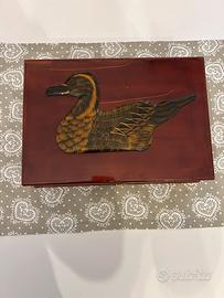 Elegante cassetta porta oggetti con una bellissima decorazione di un'anatra. - Decorazione intarsiata con dettagli dorati e marroni. - Finitura lucida e raffinata. Comprato da antiquario a Milano Misure: lunghezza 32 cm, larghezza 22 cm e profondità 8 cm