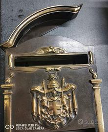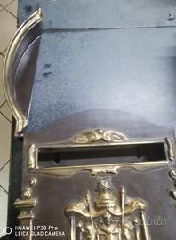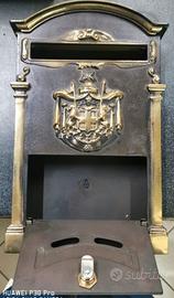 cassetta postale ottone bronzato altezza totale 39cm profonda 7cm bocca frontale superiore 18,5 x 25mm sportello frontale inferiore h10 x 18cm il tetto della cassetta si alza e la buca misura 21cm x 2,8 POSSIBILITA' DI SPEDIZIONE DA CONCORDARE IN FASE DI ACQUISTO