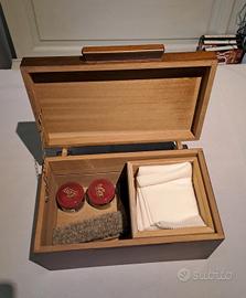 cassetta in noce verniciata studiata per contenere prodotti per la pulizia delle vs scarpe eleganti.con un ripiano scorrevole. contiene alcuni prodotti,spazzola, panno per lucidare. e un lucido in crema. misure cm .35 x 20 x 20 altezza.posso spedire. a carico dell acquirente. prodotta da me