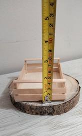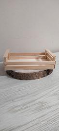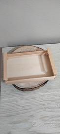 Cassetta artigianale di legno grezzo rettangolare con due sponde e due manici da decorare o dipingere. Misure come in foto