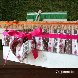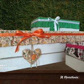 cassette in legno con pizzo in tessuto in diverse fantasie. Le cassette sono di diverse dimensioni, il prezzo varia in base alla dimensione