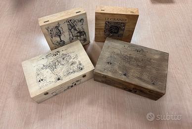 Alcune sono state colorate con impregnante color noce; altre presentano solo alcuni lati colorati in noce scuro.