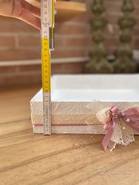 Vendo 10 cassette artigianali porta oggetti utilizzabili come porta bomboniere realizzate a mano, prezzo riferito alla singola cassetta. Misure esterne 36.5x29x8, misure interne 34,5x27,5x6 . Vendibili anche singolarmente e visionabili senza impegno