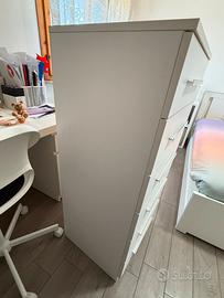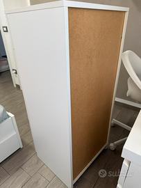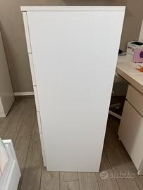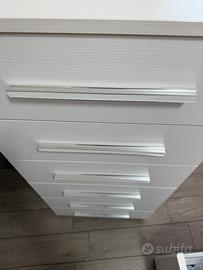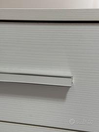 Vendo cassettiera moderna a 6 cassetti color bianco con venature effetto legno (frassinato). Mobile solido e molto capiente, ideale per chi ha bisogno di spazio ma ha una parete stretta. Dimensioni precise: • Altezza: 119 cm • Larghezza: 54 cm • Profondità: 46,5 cm • Altezza singolo cassetto: 18 cm Dettagli: • Maniglie lunghe in finitura satinata. • Cassetti scorrevoli e fondo dei cassetti integro. • Condizioni ottime, struttura stabile.