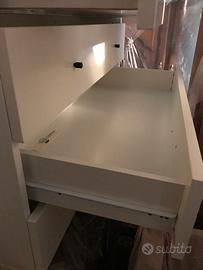 Cassettiera laccata bianca con Top, lunghezza 90 cm, profondità 42 cm, altezza 135 cm; 8 cassetti con dimensioni 82x38x12 cm con guide scorrevoli. 1° cassetto in basso leggermente incrinato come da foto, resto come nuovo