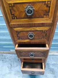 Cassettiera tipo settimino con quattro cassetti ed uno scomparto doppio. Legno intarsiato. Largo 27.5 cm Profondo 32 cm Alto 115 cm più il marmo