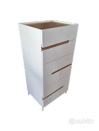 Per rinnovo Showroom, extra sconto dal prezzo di listino! Cassettiera laccata bianco microstrutturato con particolari in rovere e basamento in metallo verniciato.