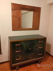 Cassettiera anni '30/'50 dipinta a mano con fantasia. Buono stato. Disponibile su richiesta anche la specchiera in foto.