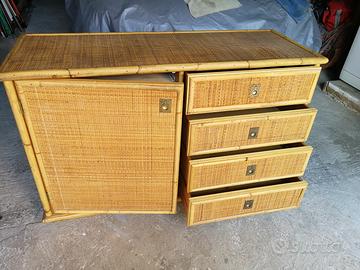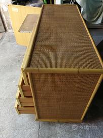 Cassettiera con un'anta, con porta computer e 4 cassetti anni 70 Originale marchiata ,della DAL VERA. Vintage materiale rattan, vimini, bambu'. Ottima da inserire in trulli o case vacanza di lusso. Tel. 3386642233