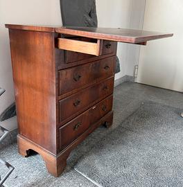 Cassettiera antica in legno, cm 63L x 33P x 78H, piano ribaltabile. In buone condizioni generali, il cassetto in é sbeccato (vedi foto) e andrebbe restaurato.