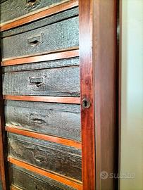 Mobiletto verticale antico con otto cassetti di cui uno (quello in basso) è un normale cassetto in legno mentre gli altri sette sono contenitori chiusi estraibili in legno e cartone rivestito.