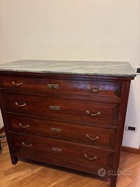 Elegante cassettiera d’epoca in legno massello, con piano in marmo grigio chiaro originale e quattro ampi cassetti con maniglie e bocchette in ottone.