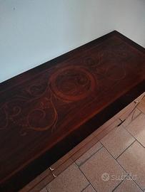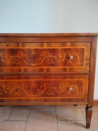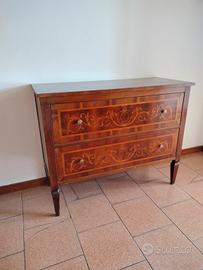 Comodino a due cassetti cn intarsio artigianale. Due ampi cassetti frontali decorati e poggia su piedini a tronco di piramide rovesciata. Il mobile non necessita particolari ristrutturazioni solo di una eventuale lucidatura. Misure circa 112x46 cm. Altezza 90 cm