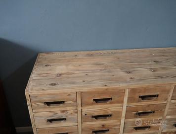 Bellissimo mobile a cassetti in stile industriale, unico e introvabile nel suo genere. Già restaurato al grezzo. Le misure sono cm: 200x60x93H