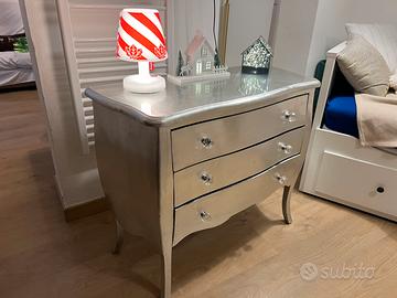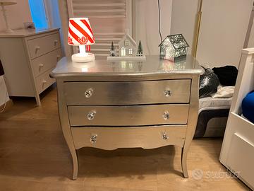 Vendo a malincuore bellissima cassettiera argentata in stile art decò. Il mobile include pomelli in plexiglas trasparente e ampi e capienti cassetti anch’essi argentati.