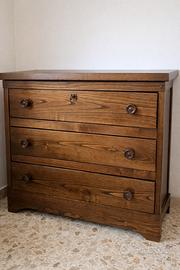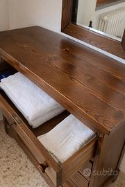 Cassettiera in legno massello con specchio – stile rustico caldo Bellissima cassettiera in legno massello, realizzata artigianalmente, completa di specchio coordinato. Un mobile solido e autentico, con una tonalità calda che rende subito accogliente qualsiasi ambiente. Perfetto per casa di campagna, casa al mare o per chi ama lo stile naturale e senza tempo. Cassetti capienti e ben funzionanti. Ideale come mobile da ingresso o camera. Condizioni ottime