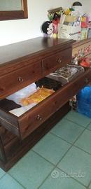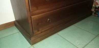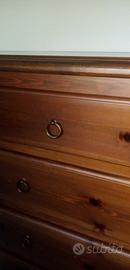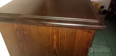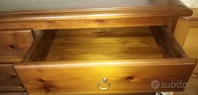 Vendo bella cassettiera fatta fare da falegname in legno di pino massiccio, molto pesante, con specchio, tenuta benissimo, 5 cassetti, utilizzata poco in quanto è in mansarda. Color miele caldo. Misure lunghezza 118 cm, altezza 85 cm, profonda 50 cm. Specchio 60x70 con spessore in rilievo di 4cm.